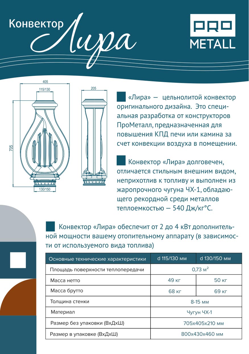 Конвектор «Лира» выполнен из жаропрочного чугуна ЧХ-1, обладающего рекордной среди металлов теплоемкостью - 540Дж/кг°C. Он долговечен, неприхотлив к топливу, подходит для любых печей с диаметром дымохода 130 и 150 мм.